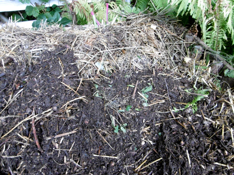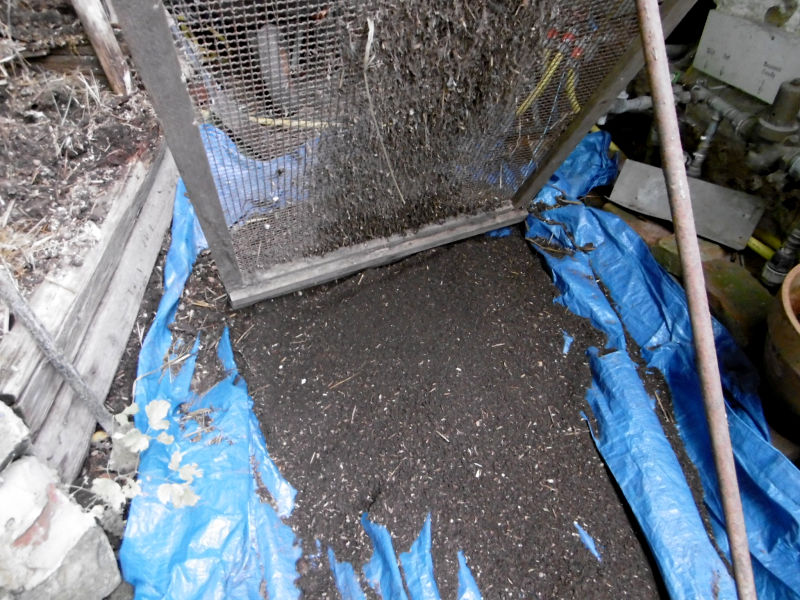 Der Rohkompost vor dem Sieb, wurde auf einem vollen Komposthaufen als Abdeckung gebracht. Auf dem vollen Komposthaufen sorgt der Rohkompost für einen schnelleren Verrottungsprozess, da sich in der Masse genügend Organismen befinden, die sich sofort an die Arbeit machen.