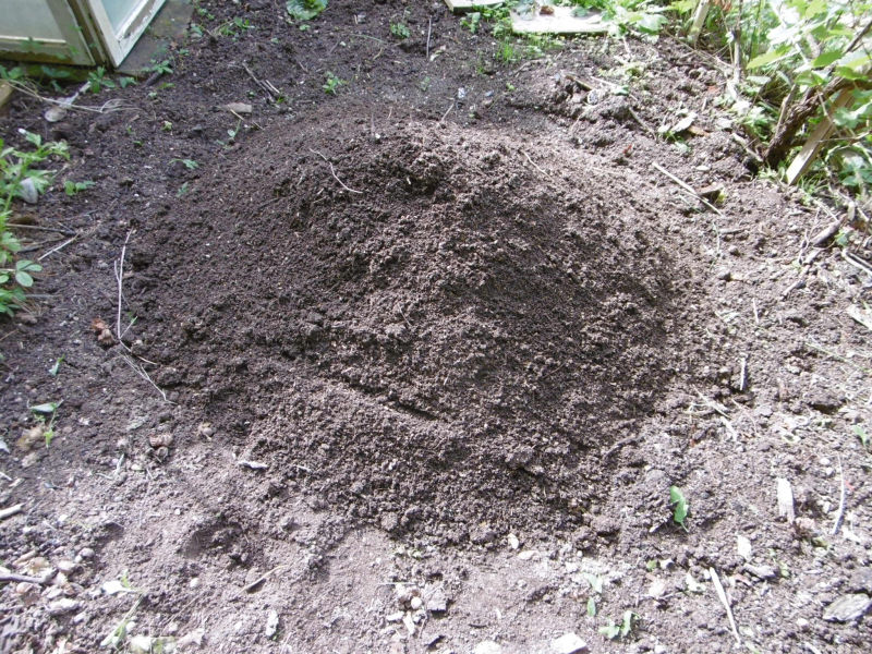 Als Zwischenlager der fertigen Komposterde ( hinter dem Sieb) kann eine freie Beetfläche genutzt werden. Nach belieben kann der Haufen mit einer dunklen Folie abgedeckt werden. In der Folie sollten sich genügend Belüftungslöcher befinden.